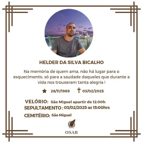 03/02/2025NOTA de FALECIMENTO É com profundo pesar que expressamos nossas condolências pelo falecimento de Helder da Silva Bicalho , nascido…