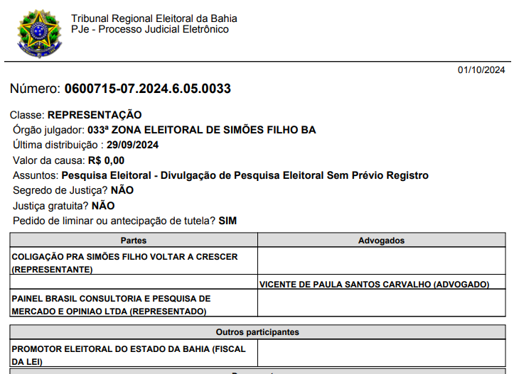 Eleições 2024: Justiça Eleitoral, Simões Filho, suspende pesquisa Painel Brasil e estipula multa diária em 20 mil Reais