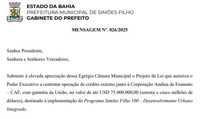Mensagem nº 026/2025: Injetará, via Empréstimo, U$ 75 Milhões de Dólares, Através do Programa “Simões Filho 100 – Desenvolvimento Urbano Integrado”