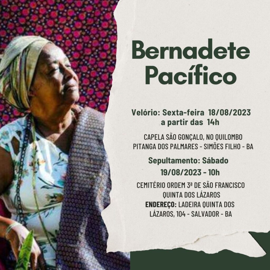 18/08/2023QUILOMBO DE LUTO, por Mãe Bernadete Pacífico, a Comunidade Quilombola de Pitanga dos Palmares, e a sociedade Simõesfilhense, consternada, sob…