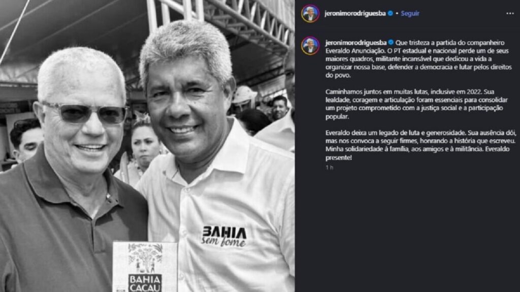 20/08/2025O ex-presidente do diretório estadual do Partido dos Trabalhadores na Bahia (PT-BA), Everaldo Anunciação, faleceu nesta quarta-feira (20), em Salvador.…