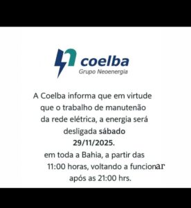 Salvador, BA: A Neoenergia Coelba desmentiu, nesta quinta-feira (27), as informações que circulam nas redes sociais e em grupos de WhatsApp sobre um suposto desligamento de energia programado para o próximo sábado (29), na Bahia. De acordo com uma nota enviada ao portal Acorda Cidade pela concessionária, a mensagem que vem sendo compartilhada é falsa e não corresponde a qualquer ação prevista pela empresa.
